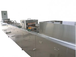 LSAP-C9/8000全自动超声波清洗机,该设备由电器控制柜和清洗系统主机组成,超声波发生器(超声波电源)和超声波清洗槽(粘接超声波换能器)。超声波发生器将工频电能转变成20KHz的高频电信号,通过高频电缆输送到超声波换能器上,换能器被加上高频电压后,产生强有力的超声振动,在液体中迅速传播,作用于超声波清洗槽内液体介质中,产生每秒2万次以上的振动,从而将工器件附着的污垢震落,达到清洗目的,该设备集输送、喷淋、超声、烘干与一体,能批量清洗工件,实现自动进行式清洗,清洗效果好,清洗速度大幅提高,既有序又整洁。